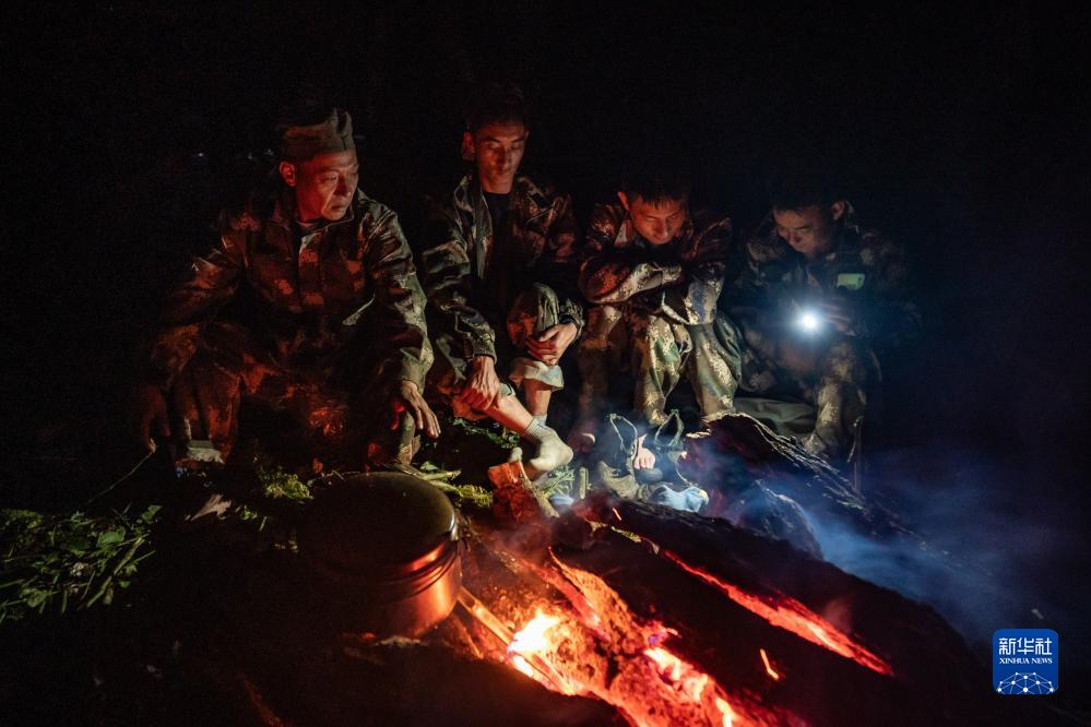 7月8日,在高黎貢山國家自然保護區,巡護隊員們在篝火旁烘干鞋襪。新華社記者 江文耀 攝