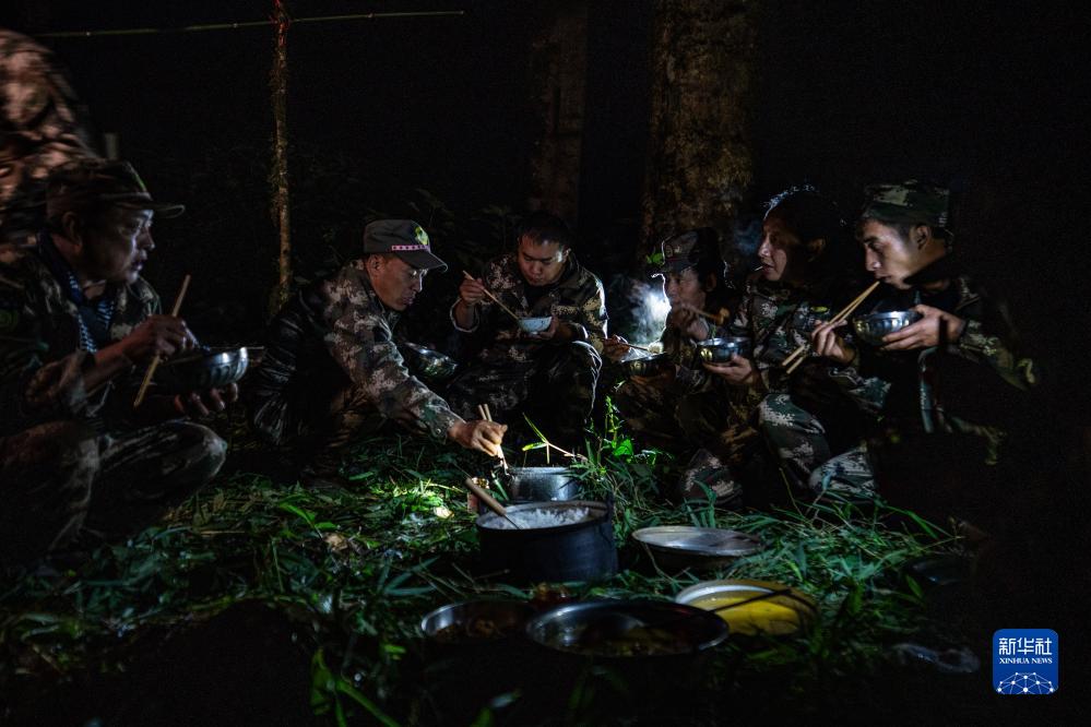 7月8日,在高黎貢山國家自然保護區,巡護隊員在吃晚飯。新華社記者 江文耀 攝