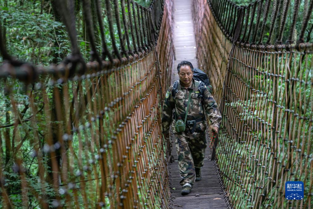 7月8日,何貴品穿過高黎貢山鹽馬古道上的索道橋,準備進山巡護。新華社記者 費茂華 攝