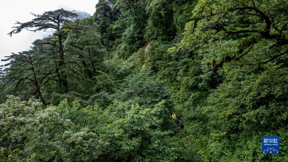 巡護隊員在高黎貢山國家級自然保護區巡護(無人機照片,7月9日攝)。新華社記者 江文耀 攝