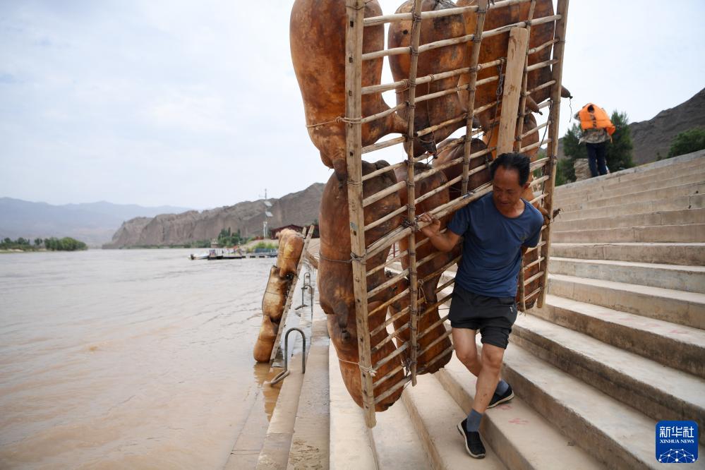 一名筏子客在黃河石林景區背著羊皮筏子準備漂流(7月11日攝)。
