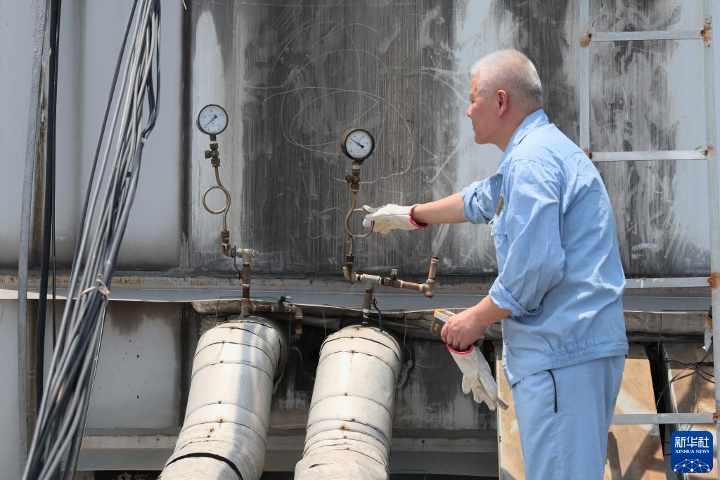 7月11日,鐵路上海站綜合車間司爐工康鳴查看鍋爐供水管道上的壓力表是否正常。