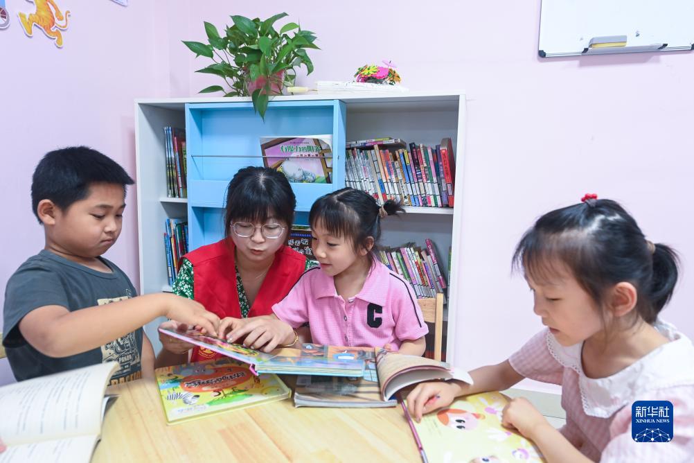 7月12日,在當日開班的烏橋村暑期夏令營里,孩子們在志愿者的陪伴下讀書。為解決外來務工人員子女暑期“看護難”問題,嘉興市南湖區新豐鎮社工站聯合烏橋村開展“候鳥歸巢,歡樂一‘夏’”暑期夏令營,外地來此過暑假的小候鳥們可以在這里學習科普知識,接受暑期安全教育,參加繪畫、手工興趣課等。