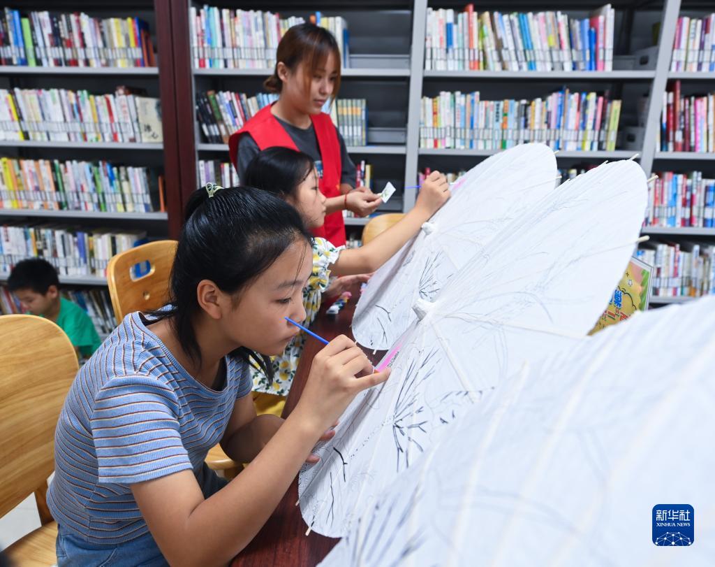 7月12日,在當日開班的烏橋村暑期夏令營里,孩子們在志愿者的指導下在紙傘上繪畫。為解決外來務工人員子女暑期“看護難”問題,嘉興市南湖區新豐鎮社工站聯合烏橋村開展“候鳥歸巢,歡樂一‘夏’”暑期夏令營,外地來此過暑假的小候鳥們可以在這里學習科普知識,接受暑期安全教育,參加繪畫、手工興趣課等。