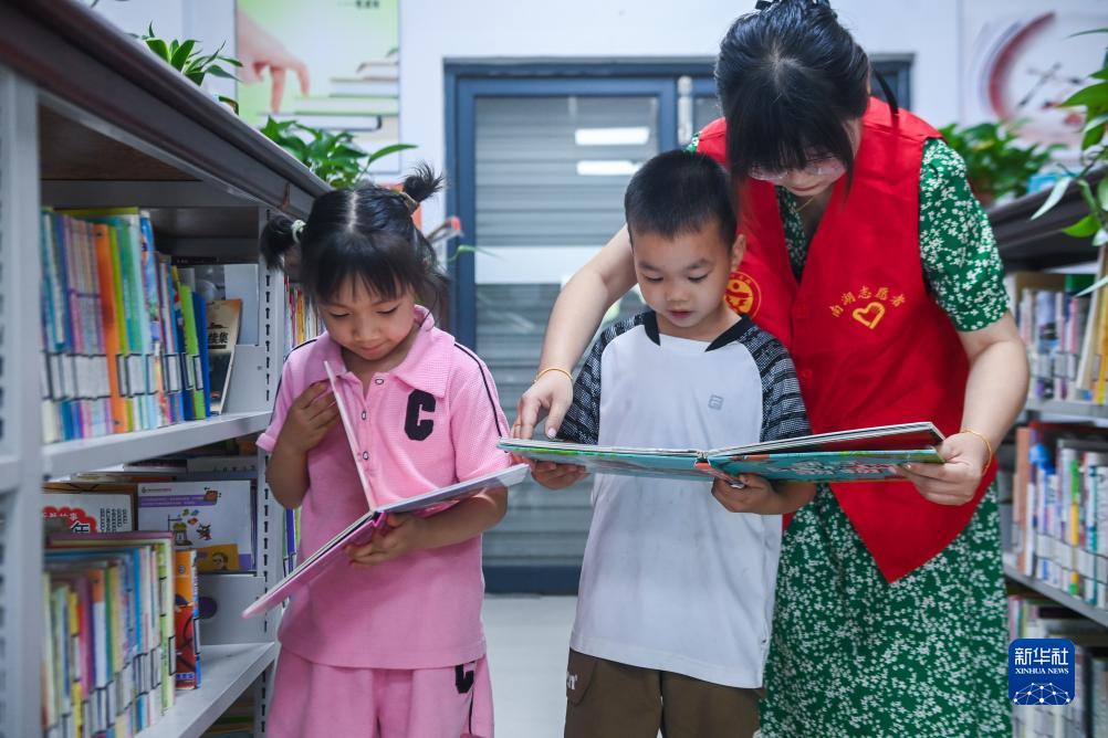 7月12日,在當日開班的烏橋村暑期夏令營里,孩子們在志愿者的陪伴下讀書。為解決外來務工人員子女暑期“看護難”問題,嘉興市南湖區新豐鎮社工站聯合烏橋村開展“候鳥歸巢,歡樂一‘夏’”暑期夏令營,外地來此過暑假的小候鳥們可以在這里學習科普知識,接受暑期安全教育,參加繪畫、手工興趣課等。