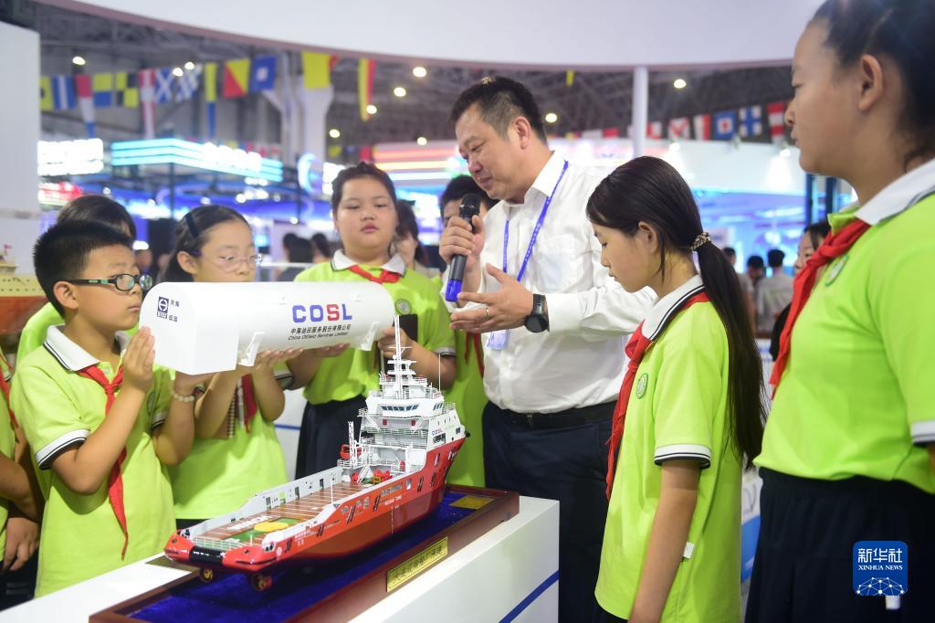 7月12日,小學生在航??萍疾┯[會上參觀LNG清潔能源動力的船舶模型。