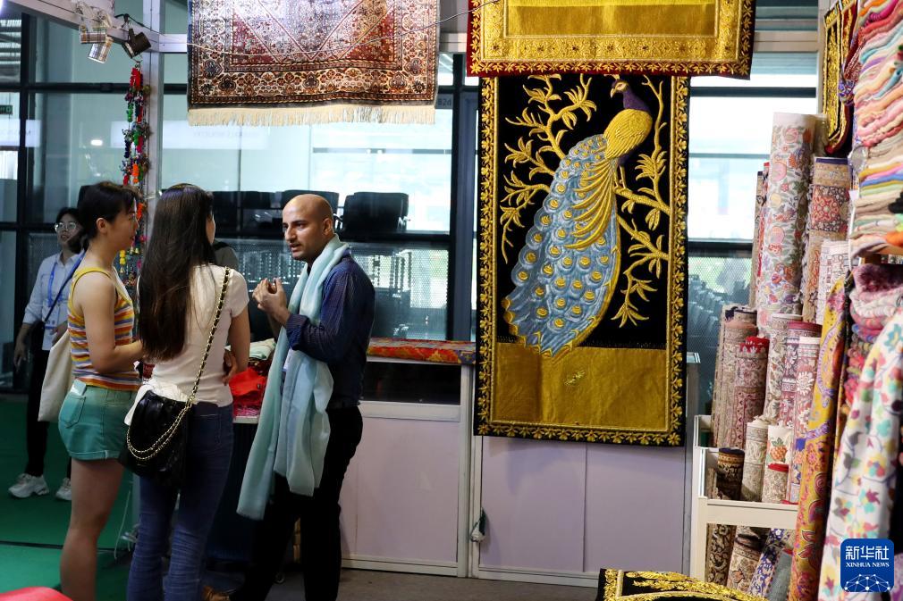 7月12日,一名來自巴基斯坦的展商(右)在展位與參觀者交流。