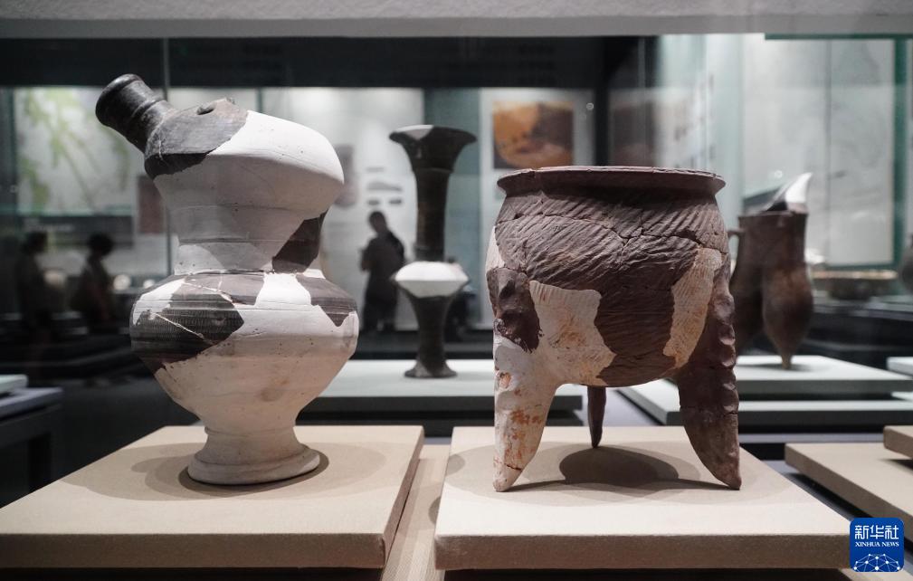 成果展上展出的二里頭夏都遺址博物館藏二里頭文化陶器(7月12日攝)。