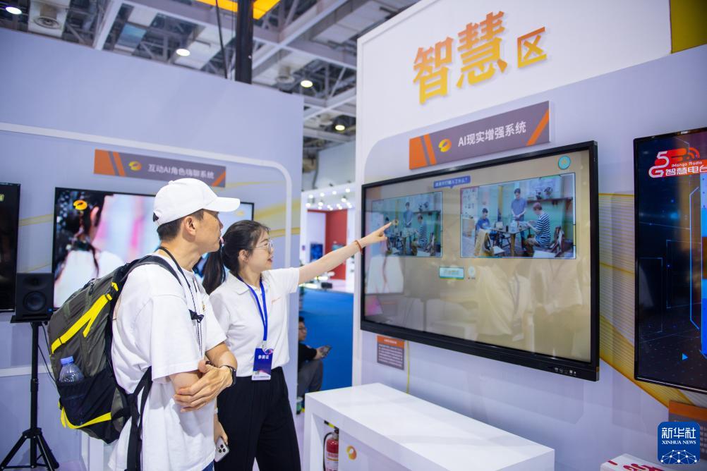 7月12日,參展商(右)在中國新媒體技術展上向參觀者介紹AI現實增強系統。
