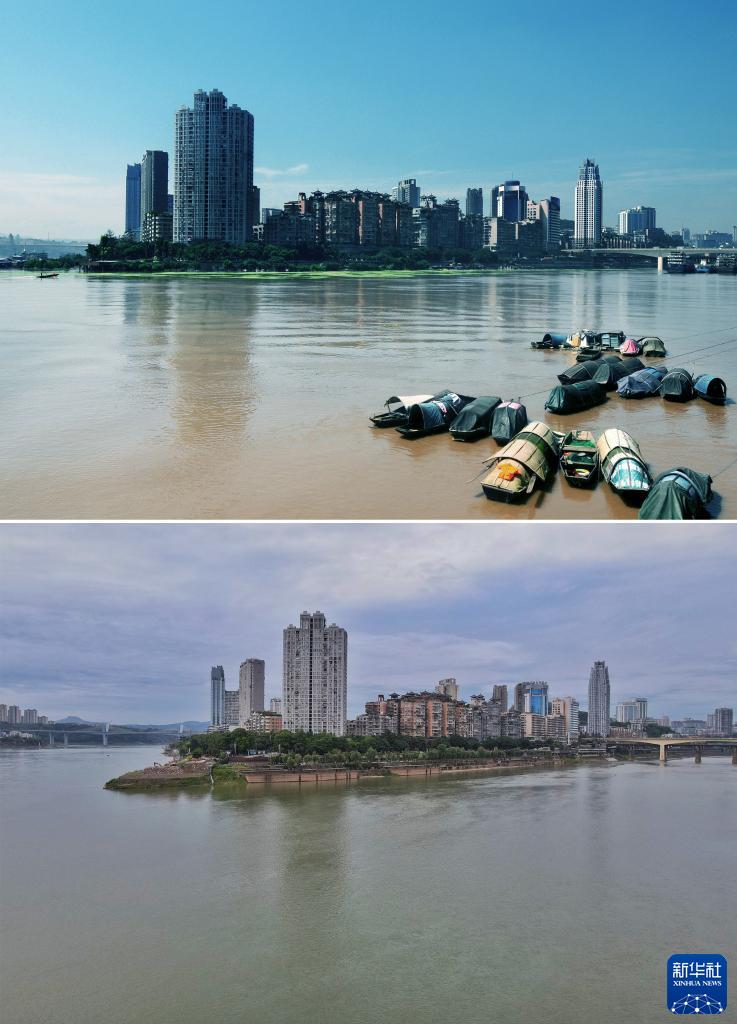 拼版照片:上圖為2012年7月,在瀘州館驛嘴沱江匯入長江處,多艘漁船在此??浚ú苄l兵攝);下圖為2023年6月1日拍攝的瀘州館驛嘴風光(新華社記者劉坤攝)。2019年,瀘州全面啟動長江流域重點水域漁民退捕工作,漁船上岸集中處置,漁民上岸分類安置。