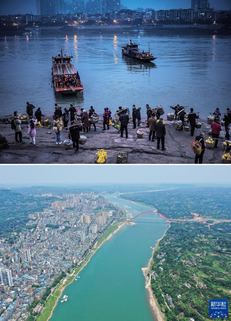 拼版照片:上圖為2021年1月27日清晨,人們在瀘州市合江縣棗林橋渡口碼頭等待乘船過江(曹衛兵攝);下圖為2023年6月27日拍攝的瀘州市合江縣城及合江長江公路大橋(無人機照片,新華社記者劉坤攝)。