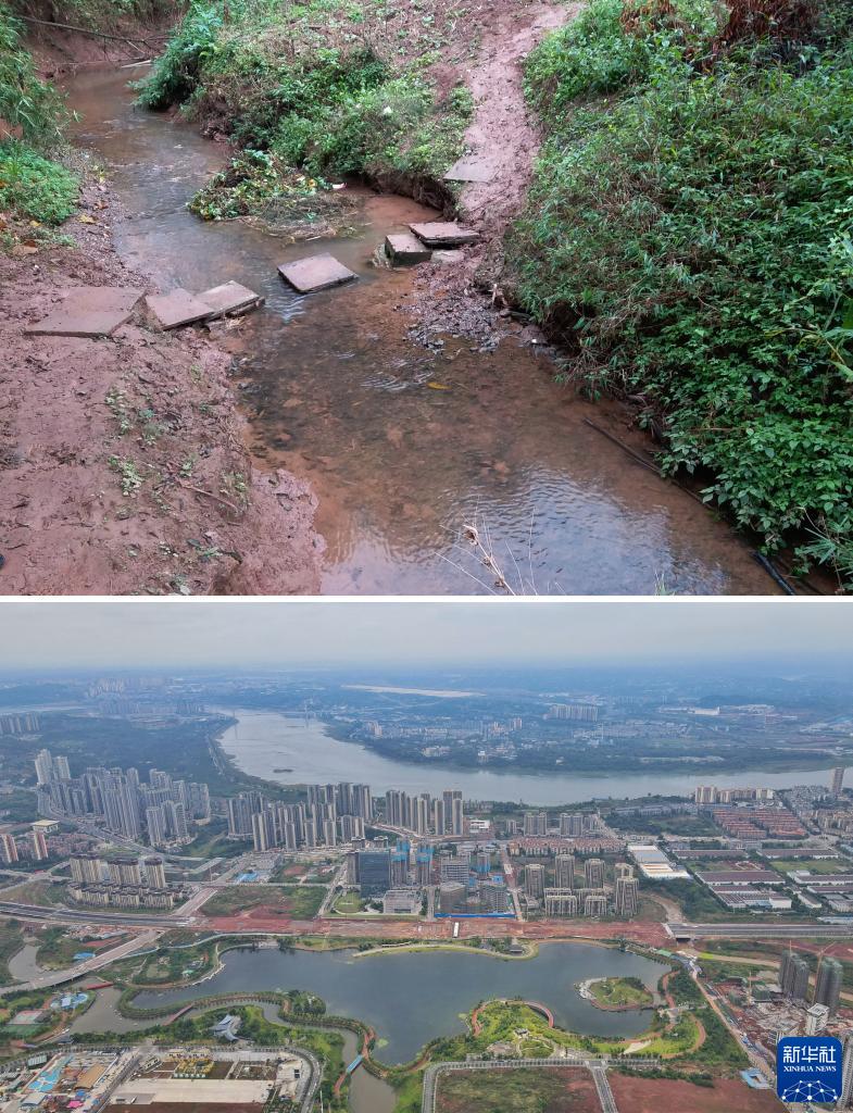 拼版照片:上圖為整治前的瀘州漁子溪(局部)(瀘州北控環保工程投資有限公司供圖),下圖為2023年6月1日拍攝的漁子溪濕地公園全景(無人機照片,新華社記者劉坤攝)。
