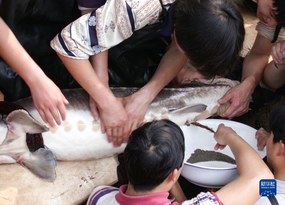 周亮(下左)在進行長江鱘人工擠卵(資料照片)。新華社發