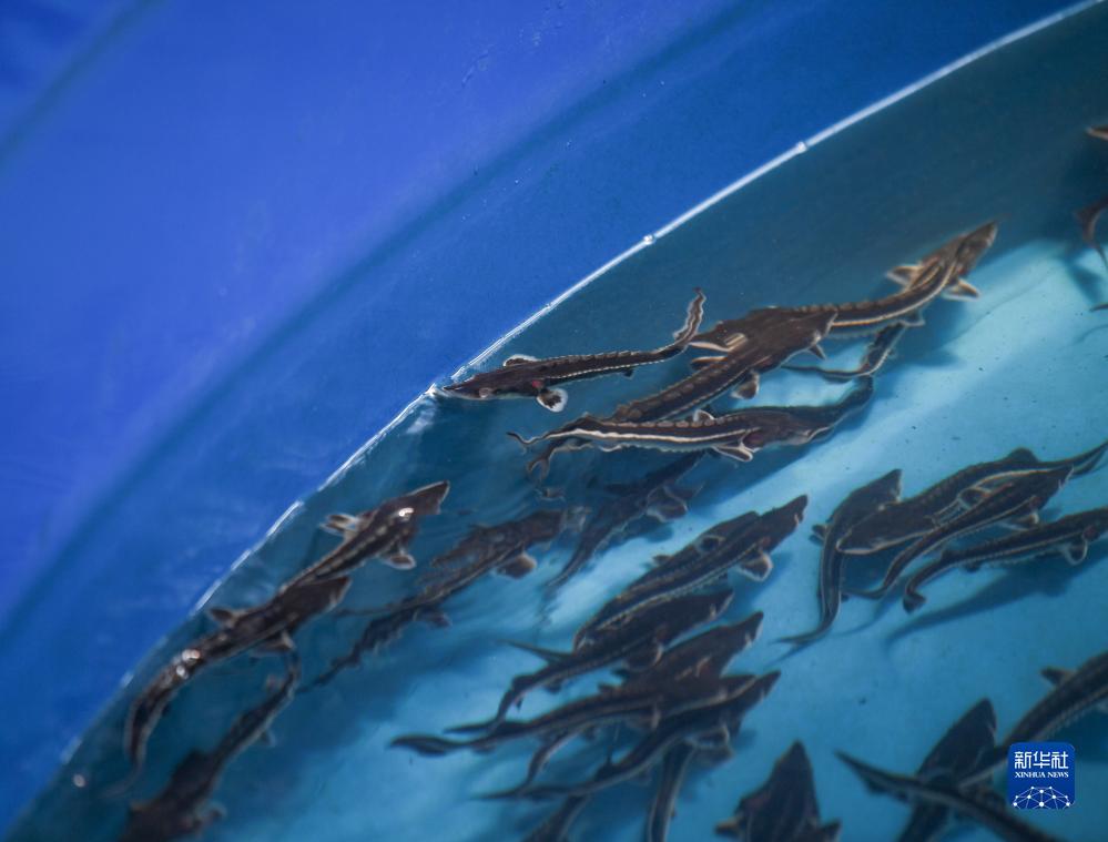這是2023年6月27日在宜賓珍稀水生動物研究所與四川省農科院水產研究所合作的繁育基地拍攝的長江鱘幼魚。新華社記者 王曦 攝