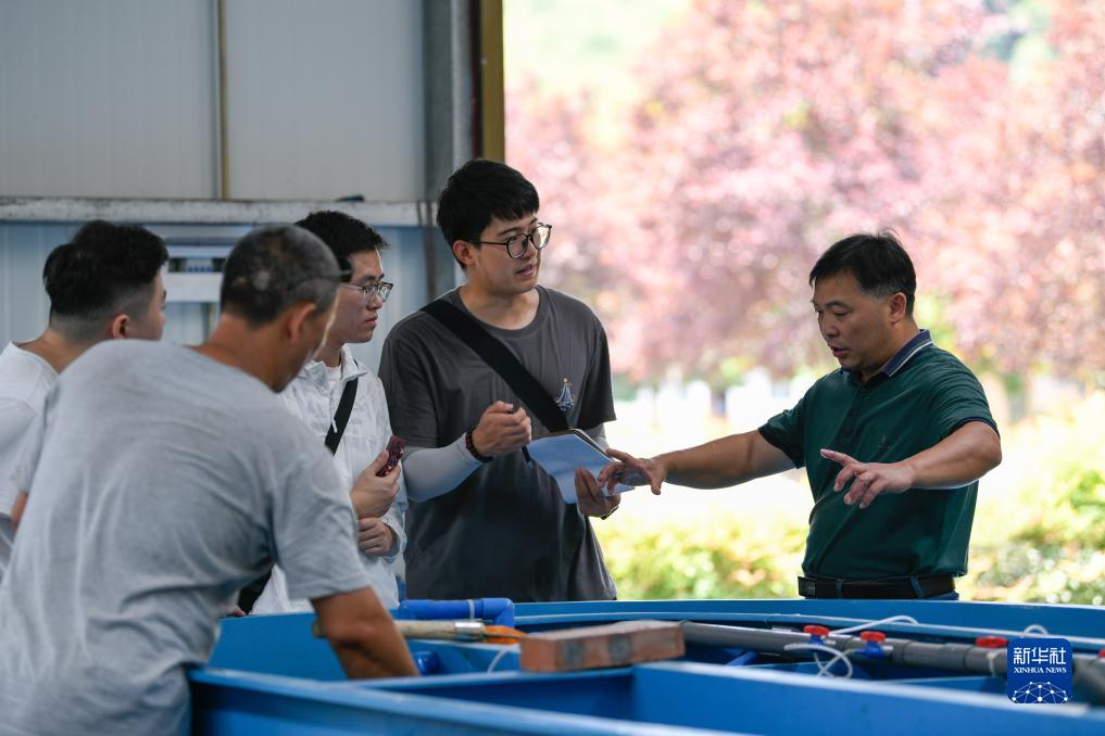 2023年6月27日,在宜賓珍稀水生動物研究所與四川省農科院水產研究所合作的繁育基地,周亮(右一)與到訪的三峽大學水利與環境學院的學生們交流養殖經驗。新華社記者 胥冰潔 攝