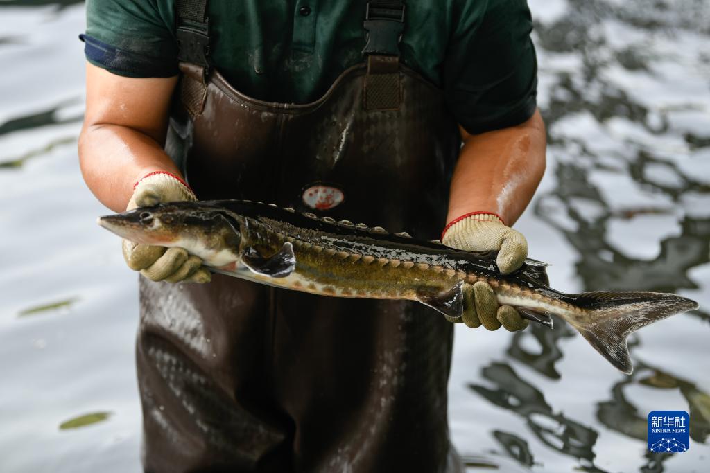 2023年6月27日,在宜賓珍稀水生動物研究所與四川省農科院水產研究所合作的繁育基地,周亮展示用于增殖放流的長江鱘。新華社記者 胥冰潔 攝
