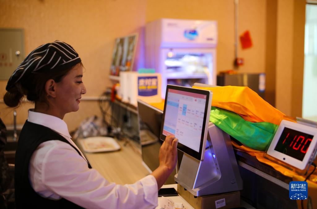 多爾格村村民尼達卓瑪在合作社開辦的茶館前臺收銀(7月11日攝)。