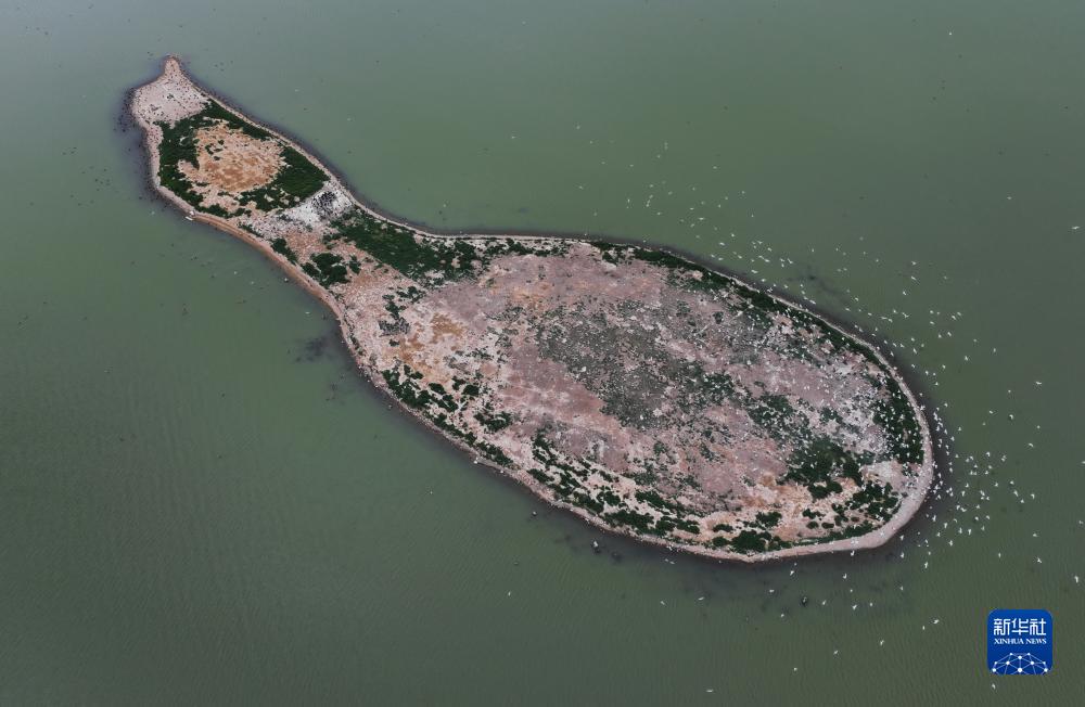 7月11日,大批候鳥在康巴諾爾國家濕地公園湖心島覓食(無人機照片)。