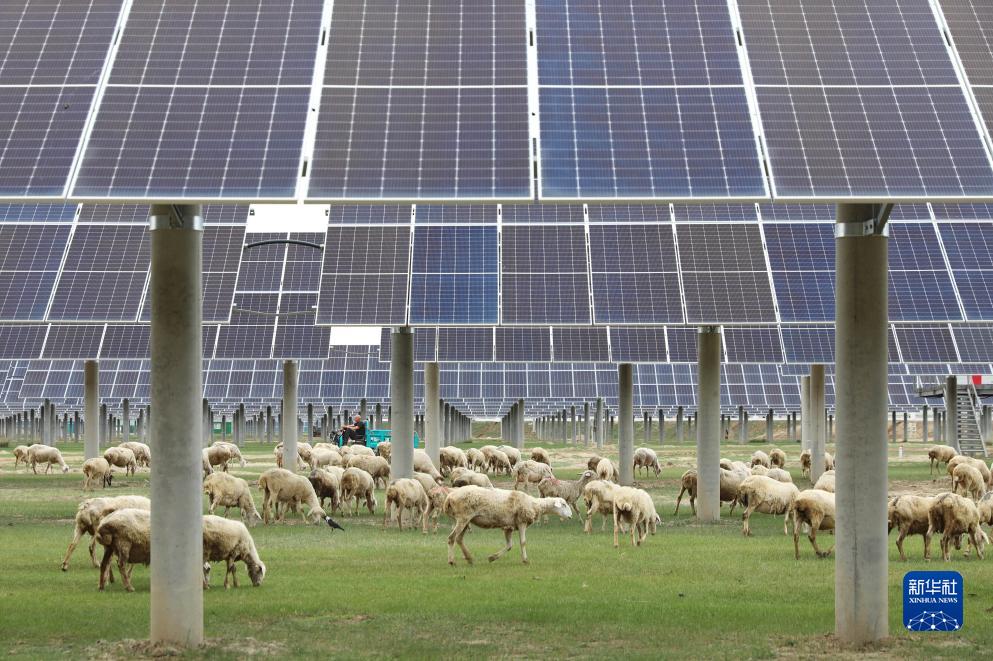7月11日,在張家口市康??h張紀鎮,羊群在光伏板下覓食。