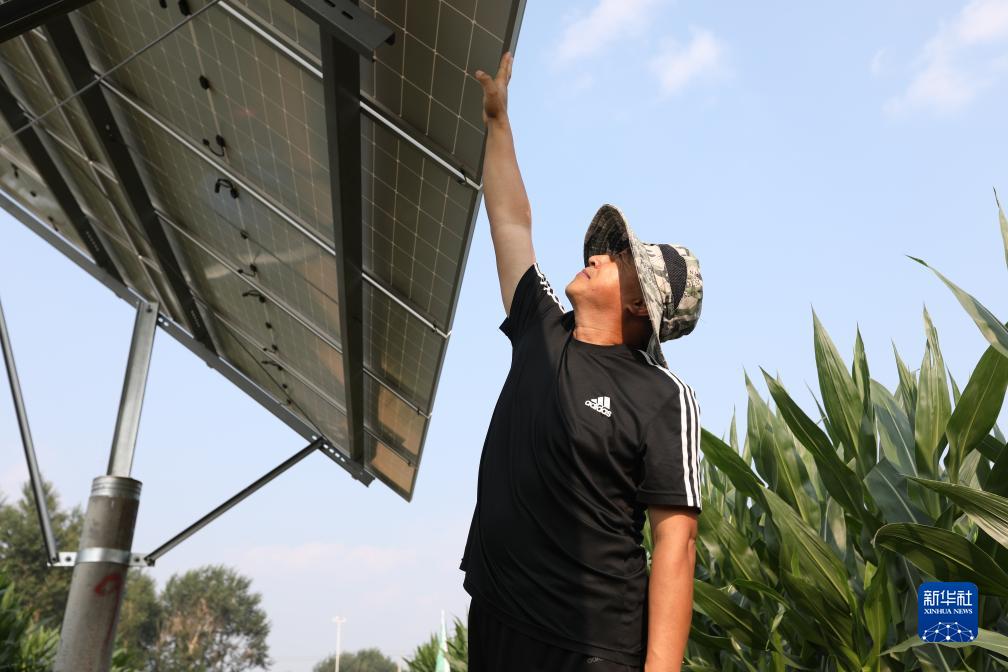 7月11日,在遼寧省彰武縣馮家鎮哈大冷村,馮家鎮政府工作人員在檢查太陽能光伏發電設備。