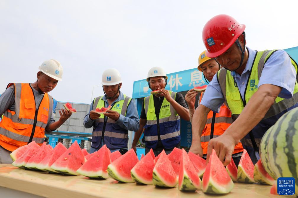 7月12日,中建二局合肥肥西產城融合安置點二期項目部工人在工地休息區茶水亭吃西瓜解暑。