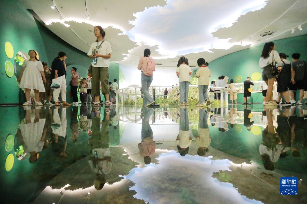 7月12日,一些家長帶著孩子在江蘇揚州中國大運河博物館參觀。
