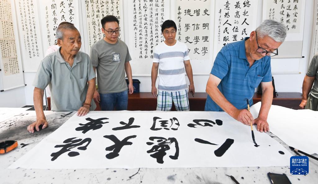7月13日,在杭州市臨安區板橋鎮上田村文化禮堂,書法愛好者書寫用于法治宣傳教育的書法作品。