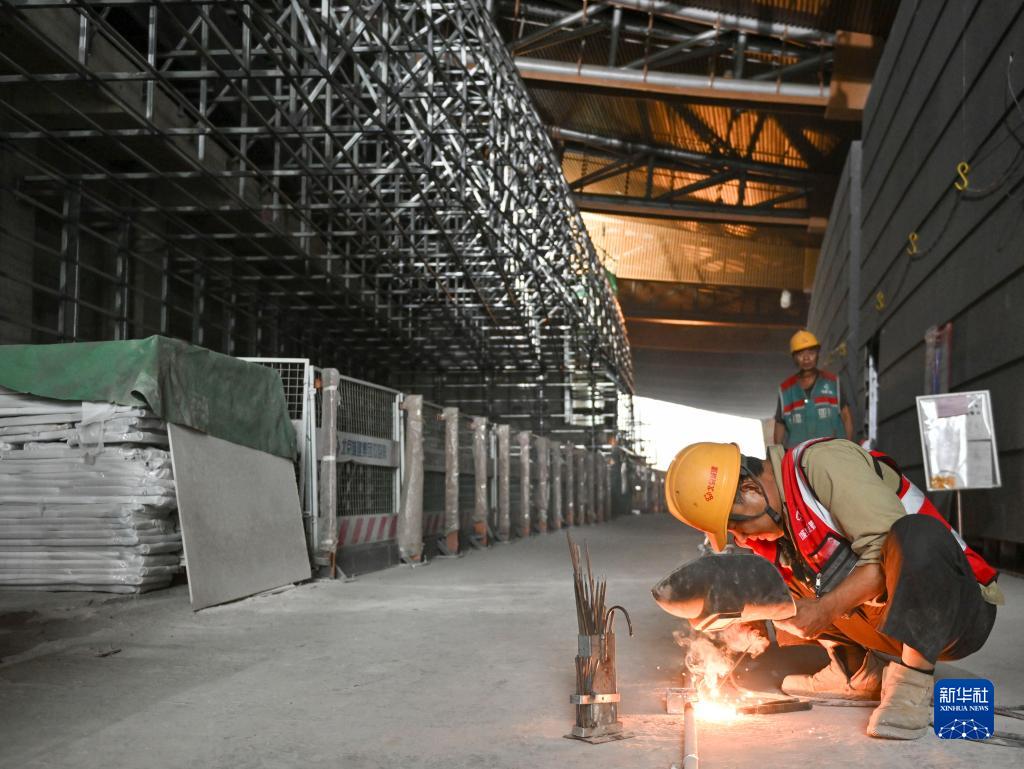 7月13日,工人在北京城市副中心博物館項目施工現場施工。