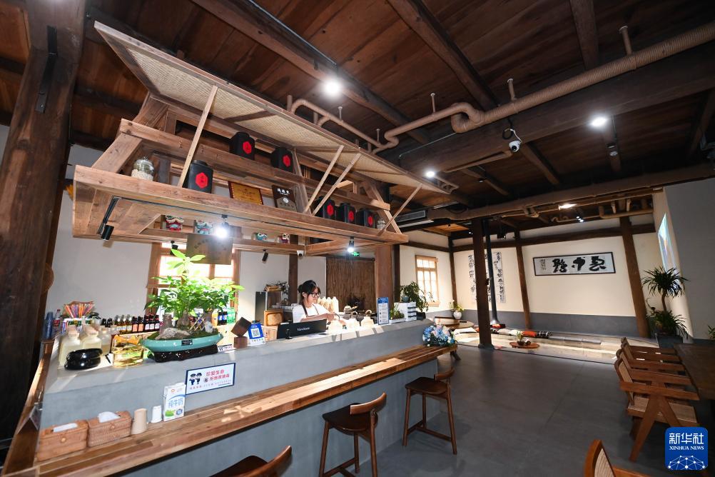 7月13日,在湍口鎮湍源里民宿里上班的村民在整理吧臺。這個由閑置糧倉和村民舊居改造而成的民宿由當地新鄉賢出資打造并經營,為村集體增加租金收入300萬元,帶動100余人次就業。