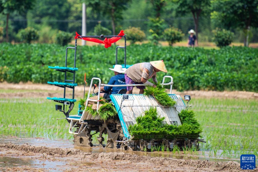 7月13日,在巖汪湖鎮武竺山村,農民駕駛插秧機進行水稻插秧作業。