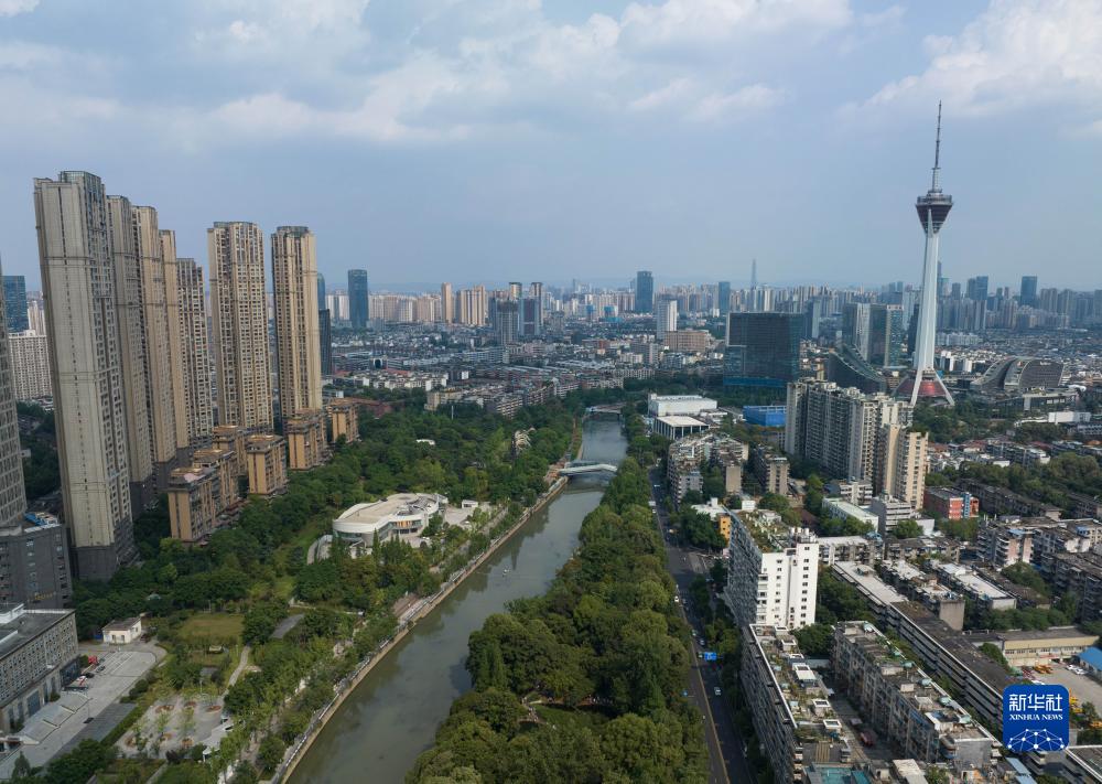 俯瞰流經成都市主城區的府河一角(6月23日攝,無人機照片)。新華社記者 江宏景攝