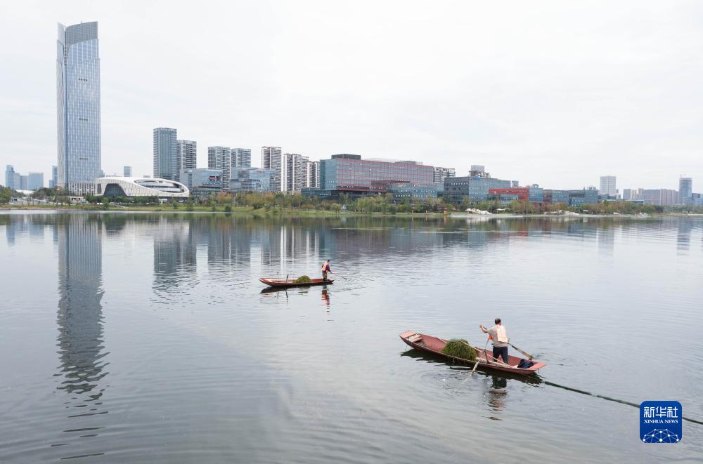 在四川天府新區興隆湖,工作人員賴小利(左)在撈水草(2022年9月21日攝)。新華社記者 江宏景攝