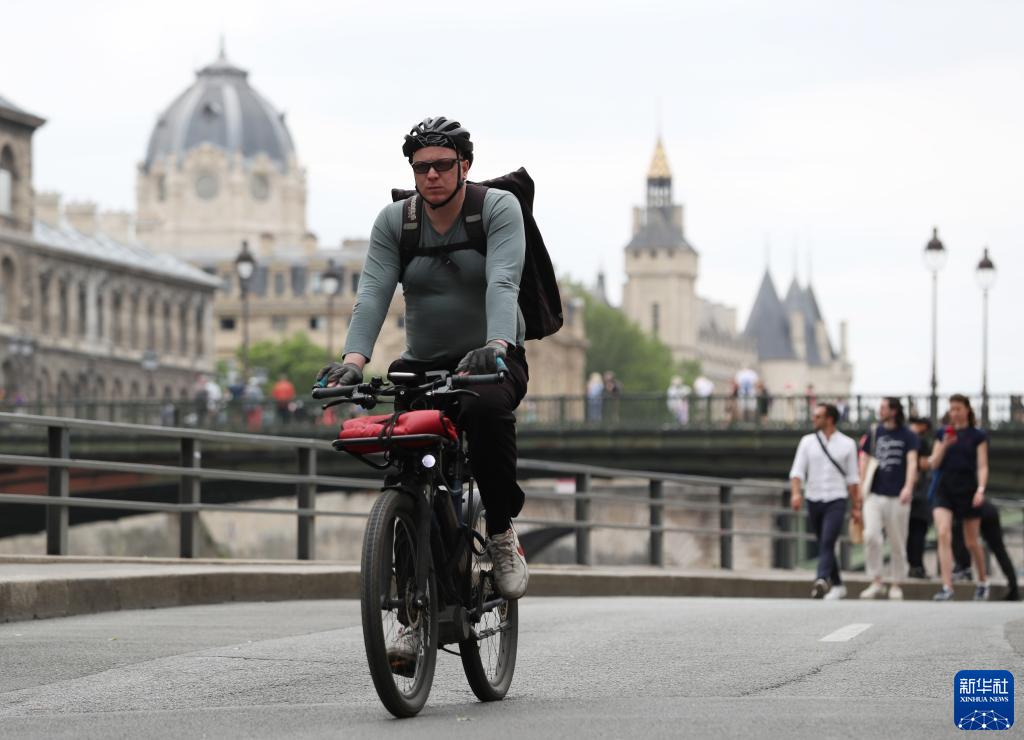 這是一名男子騎車經過法國巴黎塞納河邊(6月28日攝)。