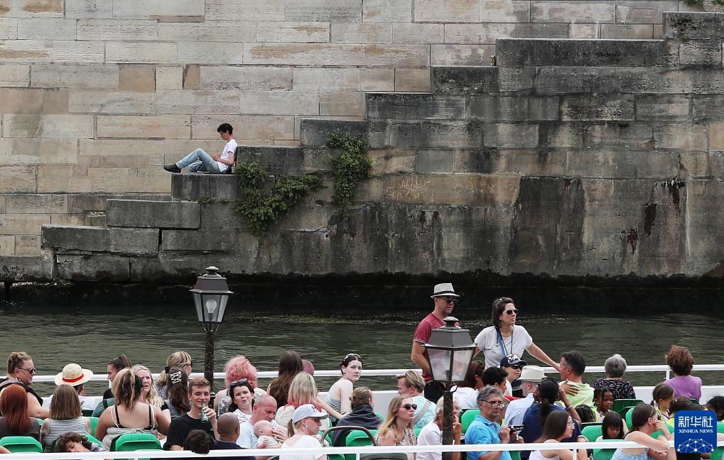 這是法國巴黎塞納河上的游船從一名在河邊小憩的男子附近駛過(6月28日攝)。