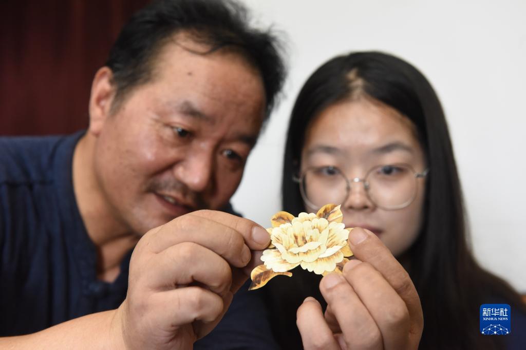 7月12日,吳永龍向學生展示麥稈畫的拼接方法。新華社記者 黃曉勇 攝