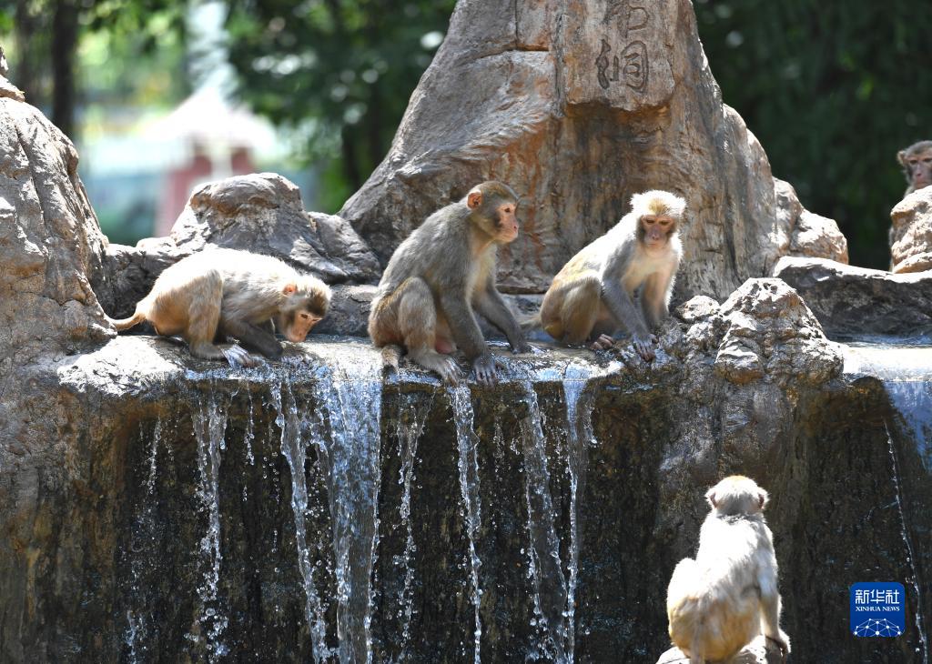 7月13日,幾只獼猴在廣西南寧市動物園戲水消暑降溫。