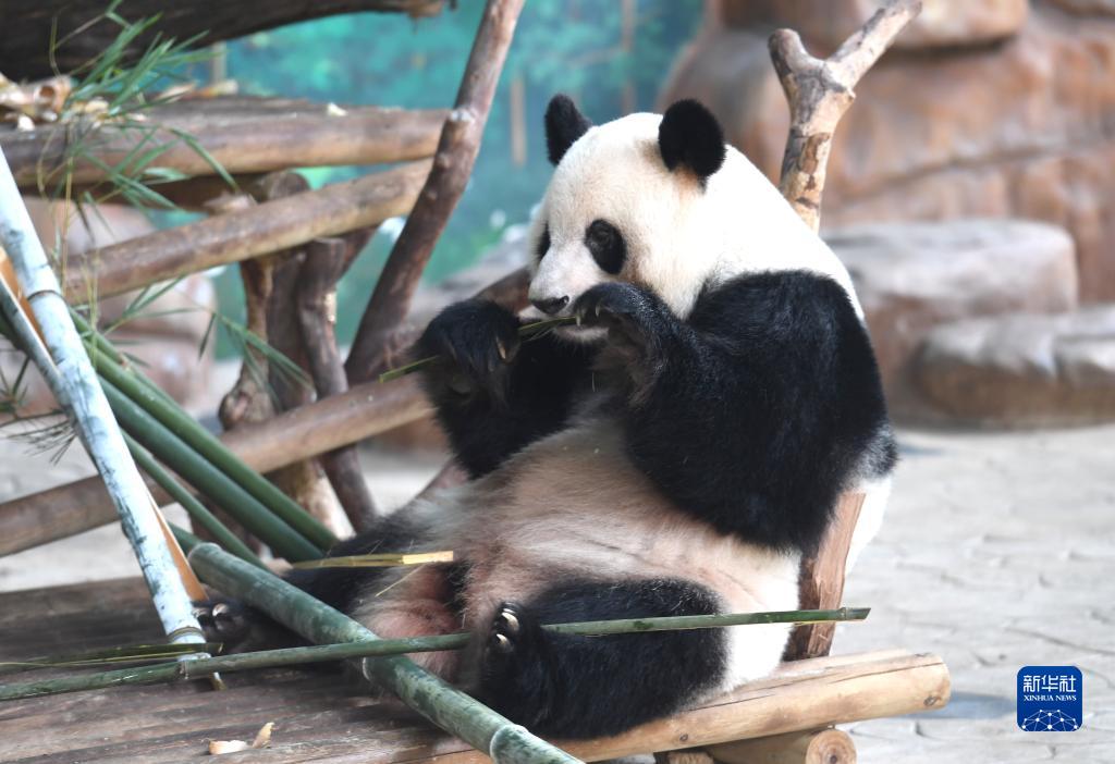 7月13日,一只大熊貓在廣西南寧市動物園空調房里享受美食。