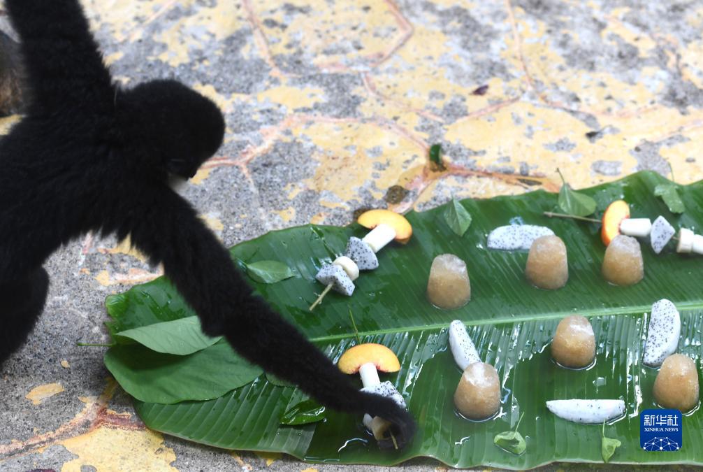 7月13日,一只長臂猿在廣西南寧市動物園挑選冰鎮水果。