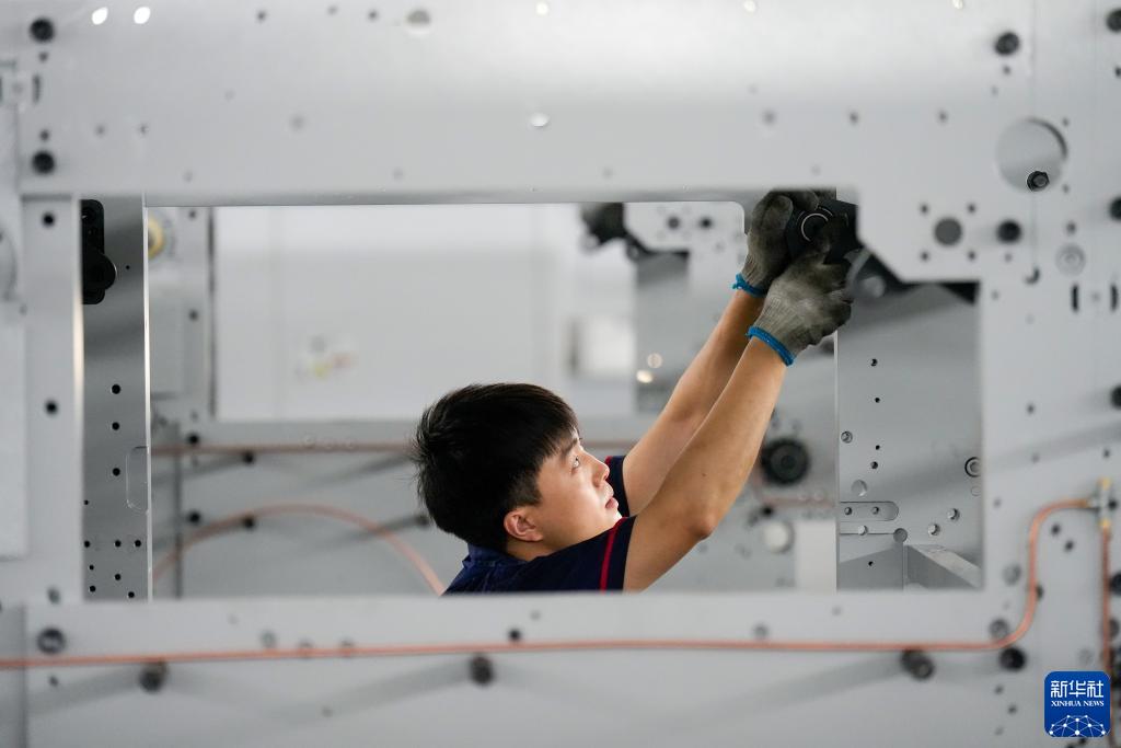 7月13日,河北省玉田縣一家印刷包裝機械制造企業的工人在安裝產品零部件。