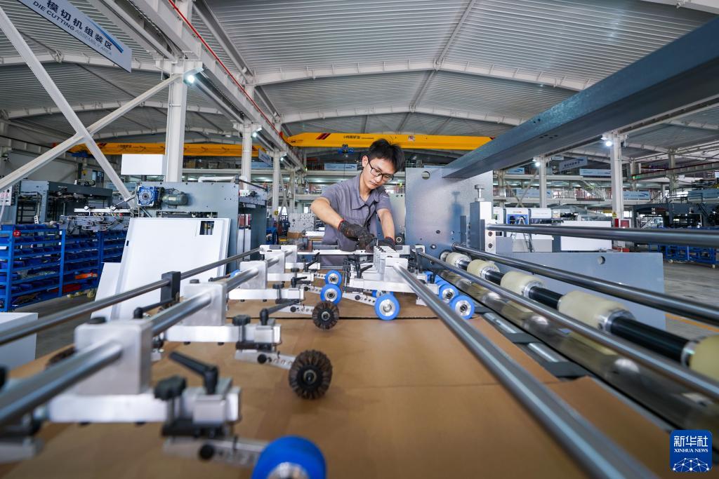 7月13日,河北省玉田縣一家印刷包裝機械制造企業的工人在安裝產品零部件。