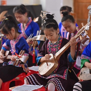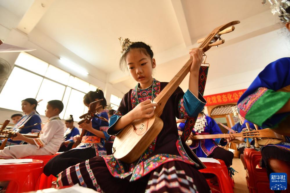 7月13日,在廣西三江侗族自治縣文化館,小學生在學習彈唱侗族琵琶歌。
