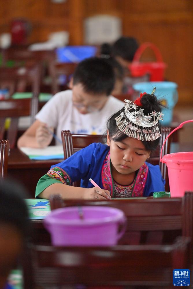7月13日,在廣西三江侗族自治縣文化館,小學生在學習侗族農民畫。