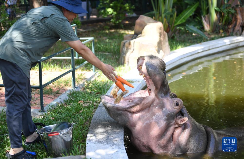 7月13日,廣州動物園飼養員給河馬投喂新鮮胡蘿卜。