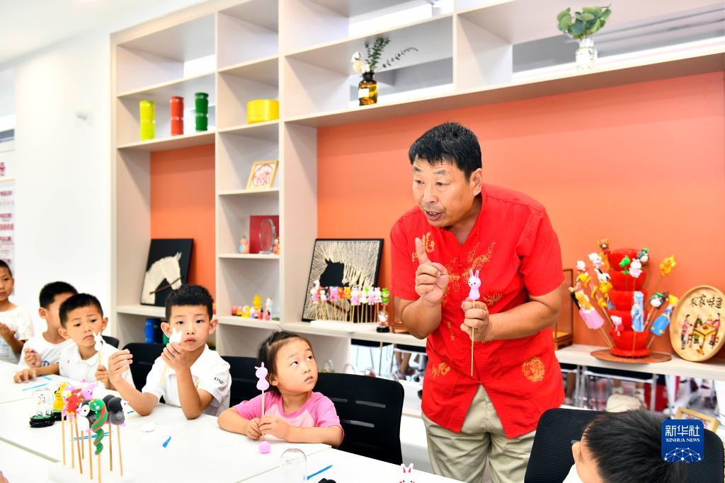 7月13日,在惠民縣姜樓鎮一處“濱濱學堂”,公益講師劉延貴教孩子們面塑知識。