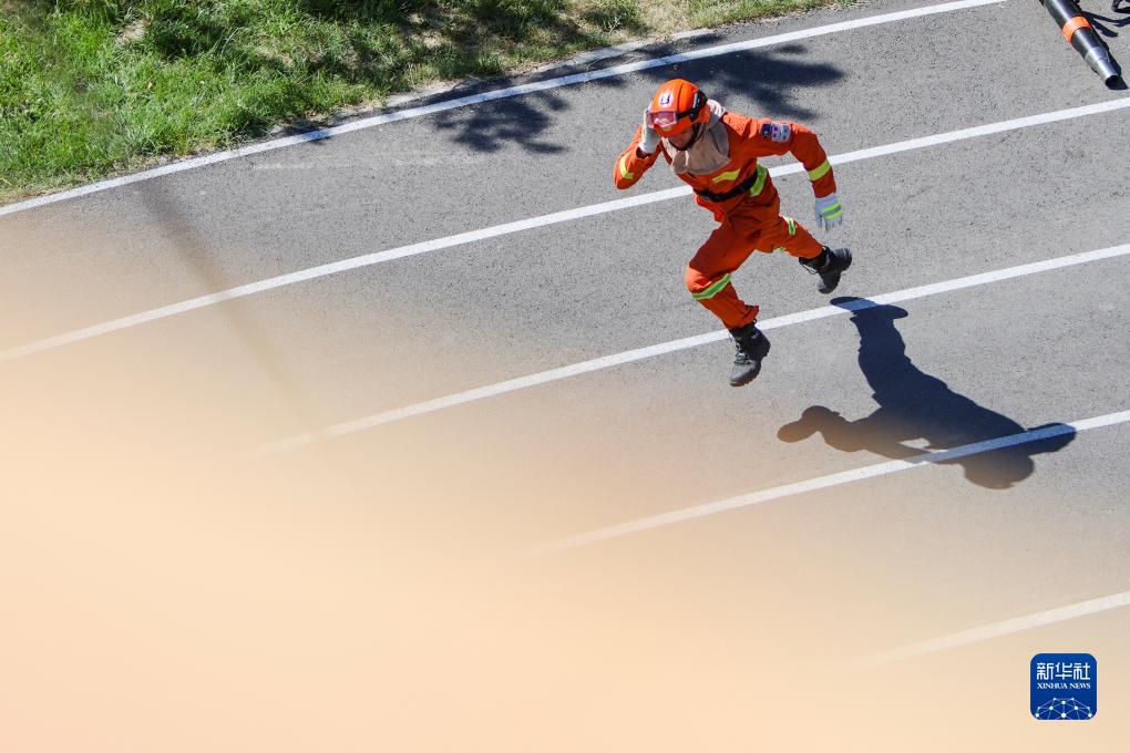7月13日,一名消防員在專業技能大比武中向下一個目標點沖刺。