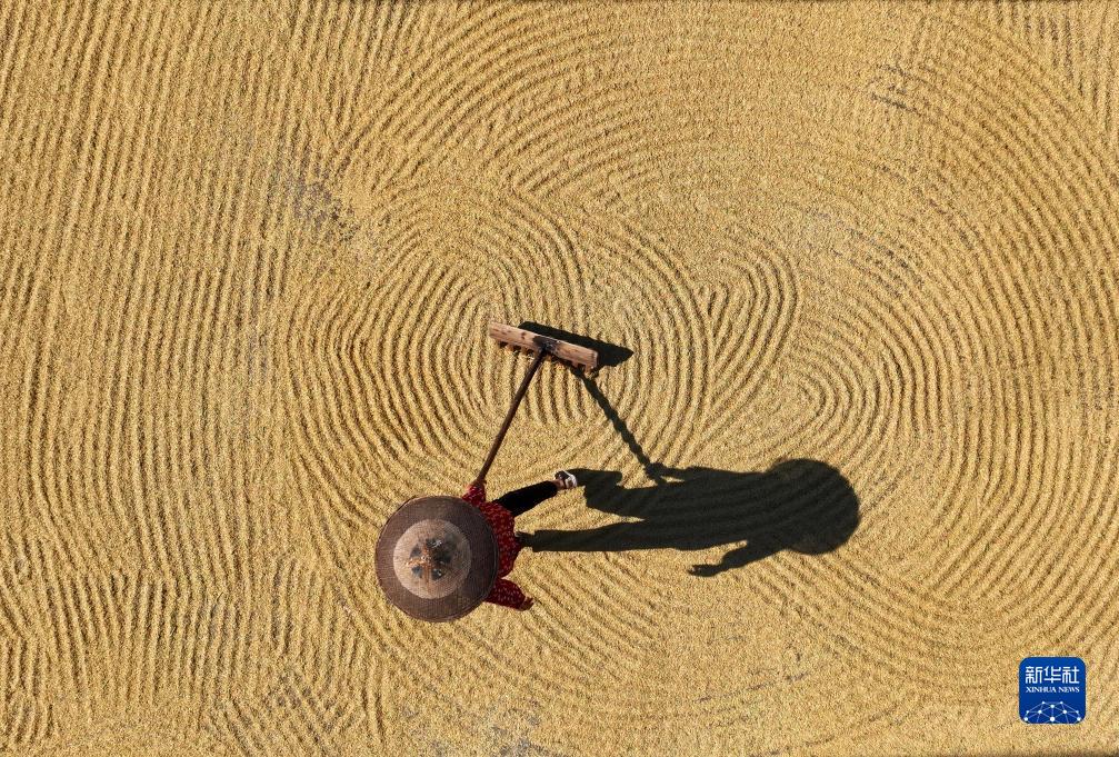 7月12日,在衡陽市祁東縣金橋鎮,當地村民在晾曬早稻(無人機照片)。