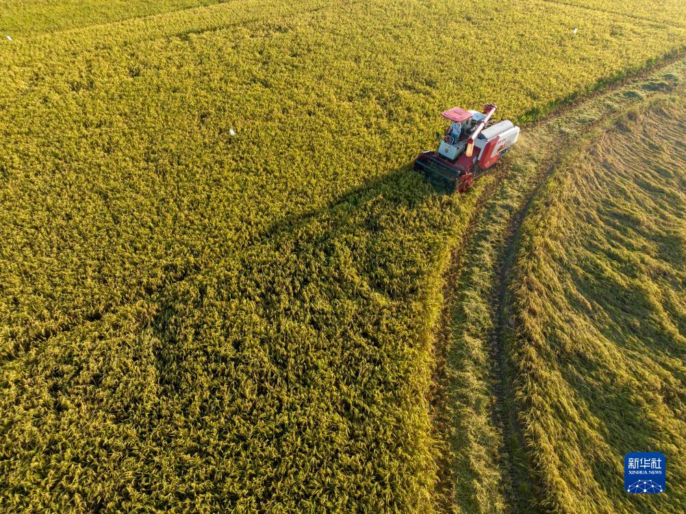 7月12日,在永州市道縣蚣壩鎮光家嶺村,農民駕駛機械收割早稻(無人機照片)。