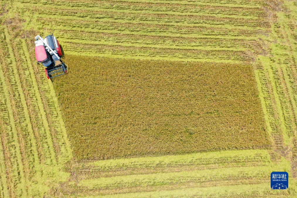 7月13日,在衡陽市衡陽縣臺源鎮臺九村,村民駕駛農機在田間收割早稻(無人機照片)。