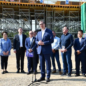 7月12日,在塞爾維亞東部城市波扎雷瓦茨,塞爾維亞總統武契奇(前)在視察中企承建的波扎雷瓦茨至戈盧巴茨快速路施工現場時講話。