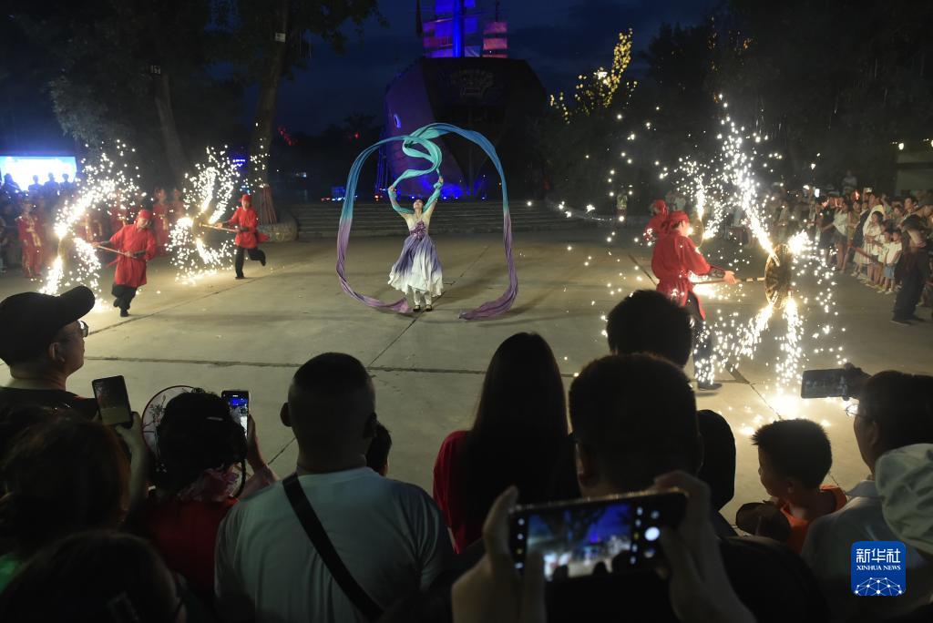 7月13日晚,游客在開封市萬歲山大宋武俠城景區內觀看文藝表演。